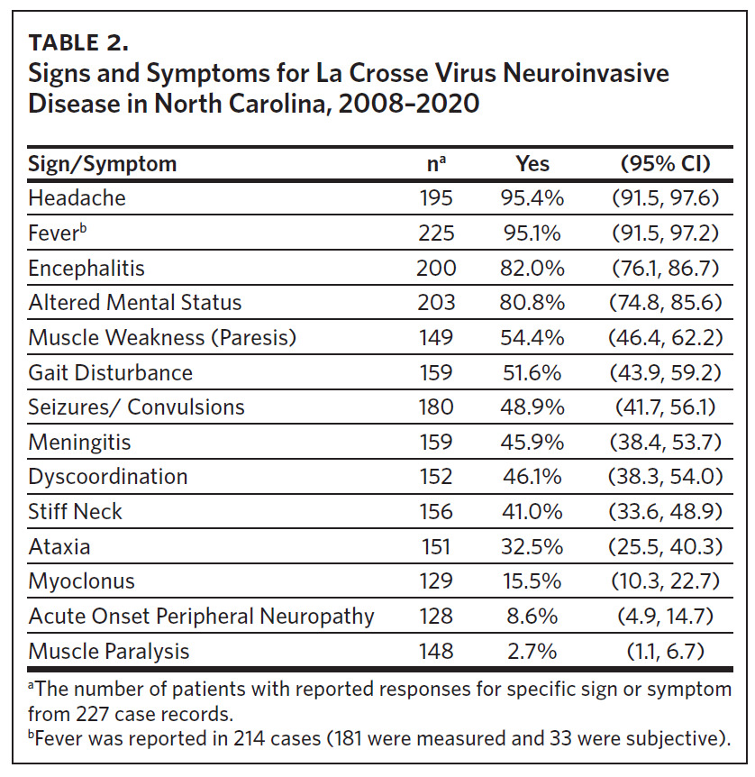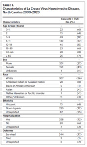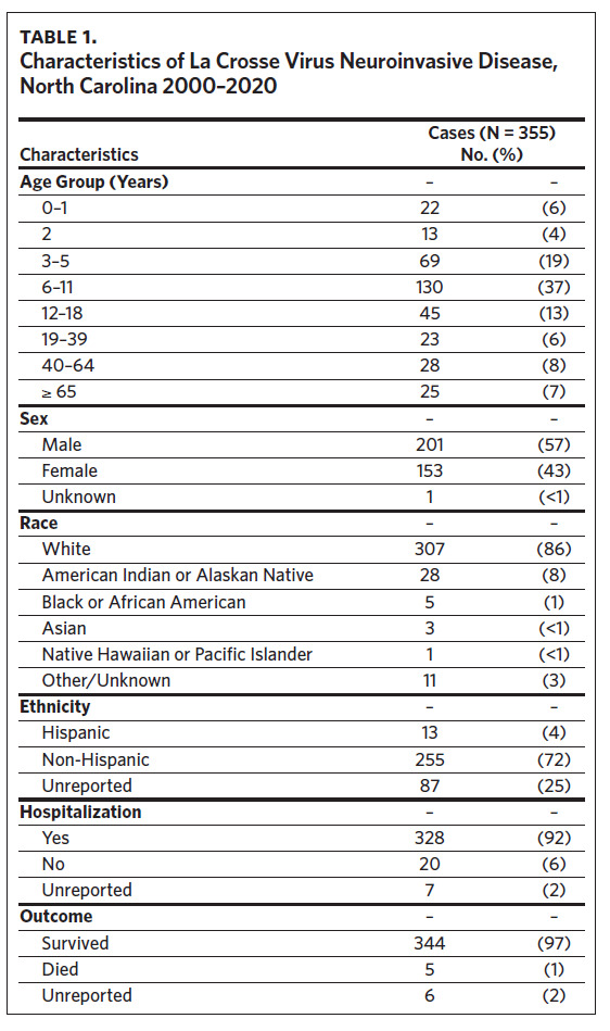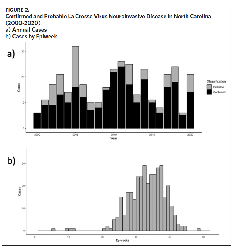Several previous publications have reported epidemiologic summaries of LACV disease; however, none have focused exclusively on LACVND in North Carolina.5,6,19,20 Therefore, the objectives of this study were to: 1) provide a descriptive epidemiological overview of neuroinvasive LACV disease in North Carolina from 2000–2020, 2) summarize clinical manifestations of LACVND among hospitalized individuals, 3) and provide updated public health recommendations based on these findings.