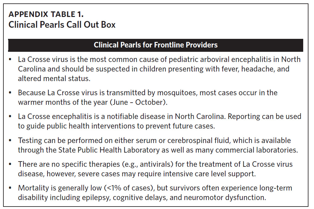 Neuroinvasive La Crosse virus disease remains endemic in Western North Carolina. Thus, clinicians and public health providers should consider La Crosse virus disease in individuals, particularly children, showing compatible symptoms and a travel history to endemic counties (See Appendix Table 1, Clinical Pearls). Our study documents La Crosse virus disease in North Carolina residents outside of historical transmission periods indicating the need for heightened clinical vigilance and improved public health surveillance efforts beyond the summer and early fall months. Taken together, the persistence of LACVND in rural Appalachian foci, combined with the lack of available vaccines or effective therapeutics, clearly classifies the disease as neglected. Public health messaging should be prioritized for both caregivers and children in Western North Carolina counties, particularly during periods of elevated transmission risk. There remains a critical need for a comprehensive strategy to prevent, detect, and respond to cases of LACVND in western North Carolina.