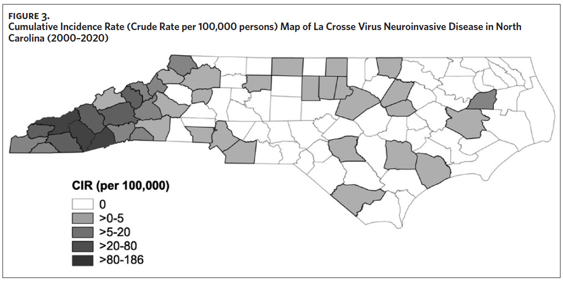 This study represents the most comprehensive analysis of neuroinvasive LACV disease in North Carolina. Previous studies in North Carolina were either embedded within national data or limited to smaller case series.5,6,10,24 Our findings reinforce the importance of LACV as a regionally persistent mosquito-borne pathogen resulting in morbidity and mortality that is predominantly borne by children in Western North Carolina. Interestingly, a single age cohort (aged 6–11 years) accounted for 37% of all North Carolina cases and all three fatal pediatric cases. Although age-specific risk factors are not well described for LACV disease, behavioral factors (e.g., time outdoors, lack of personal protection measures) and biological factors (e.g., lack of acquired immunity, physiological aging), may increase exposure or severe disease risk. Even within the larger Western North Carolina region, the cumulative incidence rates (risk) of neuroinvasive LACV disease varied greatly across neighboring counties (Figure 3).