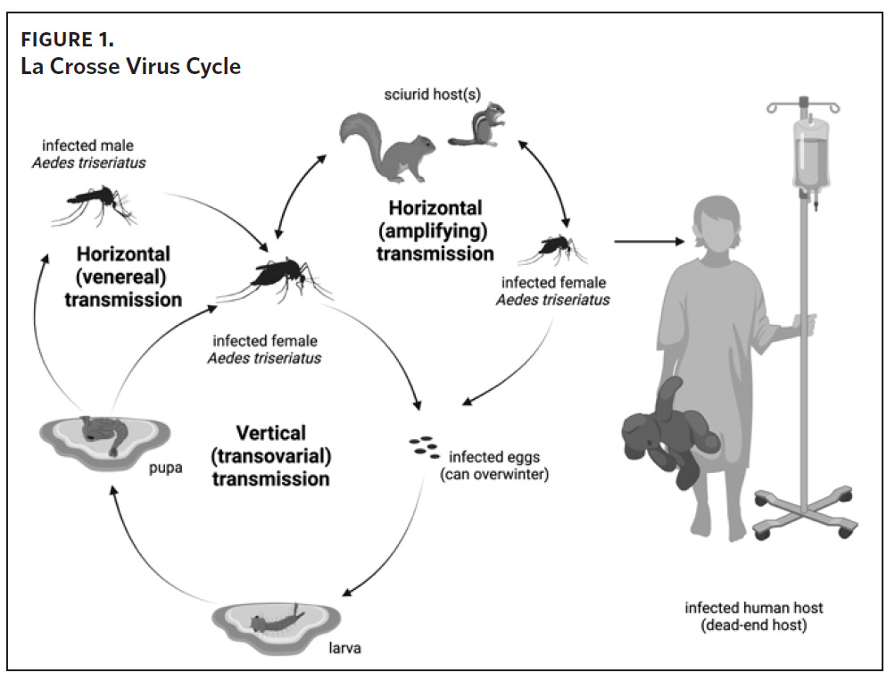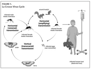 La Crosse virus is transmitted to humans through the bite of infectious female mosquitoes, primarily the eastern tree-hole mosquito (Aedes triseriatus). The natural history of LACV is complex (Figure 1). In mosquitoes, LACV can be transmitted by one of three mechanisms: 1) from female mosquito to her offspring (vertical transmission), 2) by means of amplifying rodent hosts such as chipmunks and gray squirrels (horizontal transmission), 3) and from an infected male mosquito to uninfected female mosquito during mating (venereal horizontal transmission).8,9 La Crosse virus also overwinters from one year to the next in infected mosquito eggs, creating the potential for foci with persistent infection risk.9,10 Humans are dead-end hosts (i.e., they do not develop sufficient viremias to infect other mosquitoes) that are exclusively infected by the bite of a mosquito.11