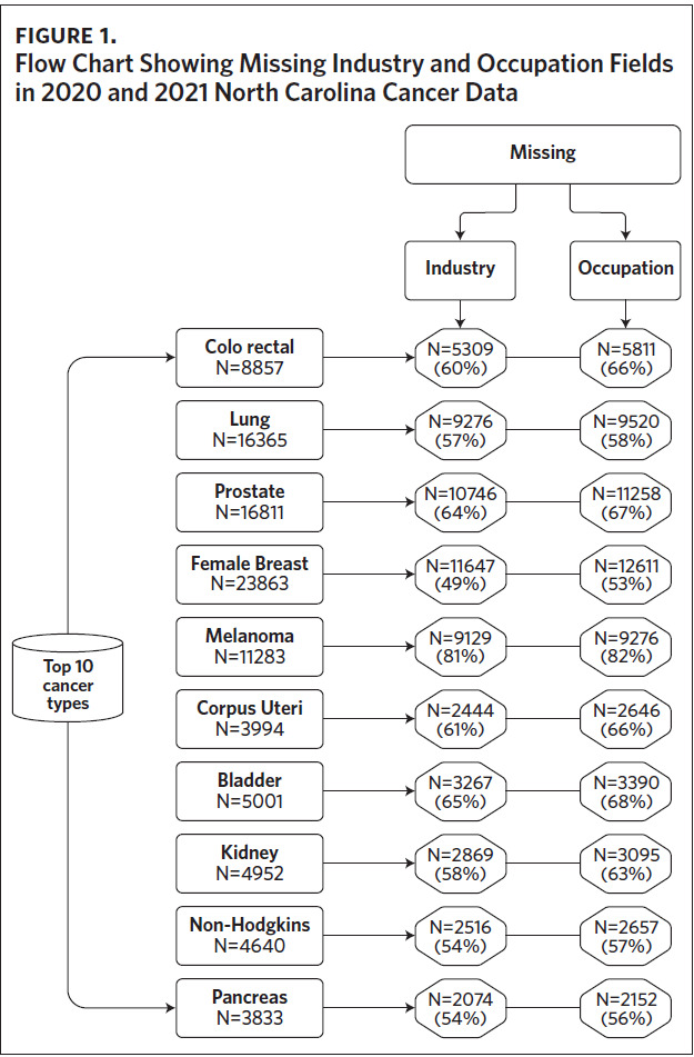 To promote consistency in the collection of I/O terms, the NC CCR requires that data reporters follow the guidelines specified in A Cancer Registrar’s Guide to Collecting Industry and Occupation.22 This guide specifies consistent terminology for special circumstances such as minors, homemakers, military personnel, self-employed, retired individuals, and when the usual occupation or industry is not known. The 2021 NC CCR I/O cancer data was evaluated to determine the percent of top 10 cancer types diagnosed that have complete I/O data. At the time of analysis, 2021 was the most recent diagnosis year finalized for data release and use. The cancer types evaluated were cancers of the colon, lung, prostate, breast, bladder, kidney, corpus uteri, and pancreas; melanoma; and non-Hodgkin’s lymphoma. Inclusion criteria included 1) individuals diagnosed with cancer and 2) individuals who were at least 15 years old, and therefore eligible to work according to North Carolina labor laws.23