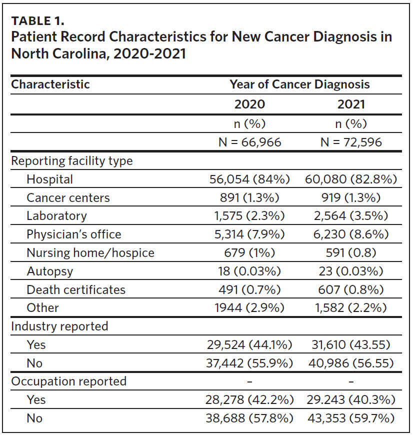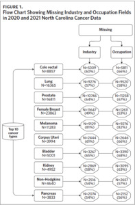 For researchers to identify an increased risk of work-related, adverse cancer outcomes, I/O completeness in cancer registry data needs to be improved. Patient registration, clinical staff, and providers should routinely ask cancer patients about their I/O and record it in the EHR. Vendors should include I/O as essential demographic fields in their EHR platforms to promote uniform categorization and data retrieval. Data reporters should apply best practices to improve record review procedures and documentation completeness in their cancer data reporting. Training resources are now available to the healthcare community on how to collect I/O data. Linkages with external occupational data sources continue to be essential for conducting studies among at-risk populations. For researchers seeking supplemental data on I/O of people diagnosed with cancer, death records may be a valuable source of I/O data. A more complete understanding of population-level cancer trends by I/O can inform evidence-based occupational health interventions, regulations, and policies to prevent occupational cancers and make workplaces safer for everyone in North Carolina.