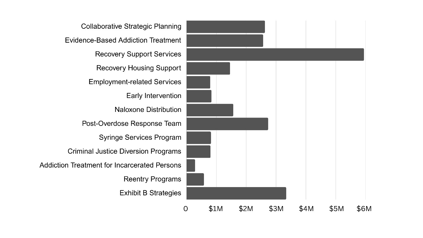 Local governments must also report the actualized spending of opioid settlement funds each fiscal year. Between July 1, 2022, and June 30, 2024, 75 local governments spent over $24 million of the available opioid settlement funds (Figure 2). Recovery support services and post-overdose response teams had the highest funding disbursements, at $5.9 million and $2.7 million respectively (Figure 2).15