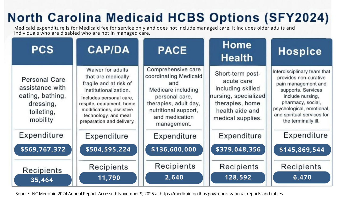 HBCS are essential to promoting the health, well-being, and independence of older adults by enabling care in the most integrated, cost-effective setting—home. Yet North Carolina’s HCBS system faces mounting strain from workforce shortages, administrative burdens, and caregiver burnout. These challenges lead to service delays, reduced availability, and increased out-of-home placements, undermining HCBS goals.