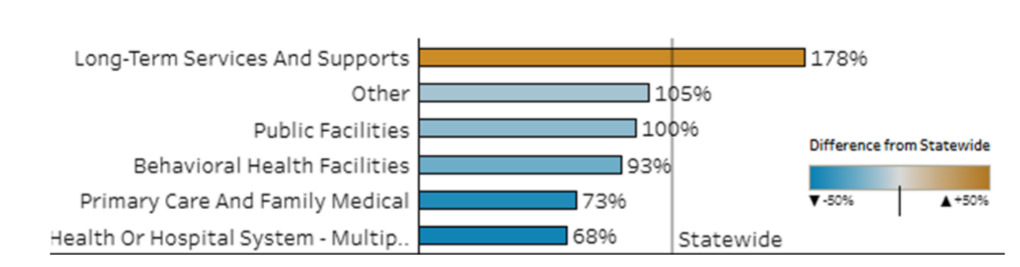 Recent data from the NC Center on the Workforce for Health found that roughly 1 in 8 certified nursing assistant (CNAs) positions in LTSS (a settings category inclusive of HCBS) are unfilled.9 If that seems low, it is likely because turnover rates create a nearly constant demand for more nursing assistants. This same survey found that the CNA churn rate in LTSS is 178%.9 That means if an employer starts the year with 10 CNAs, they can statistically anticipate onboarding 18 new CNAs as positions turn over throughout the year. In some parts of the state, the churn rate exceeds 200%.9 Figure 2 shows churn rates by CAN setting type.