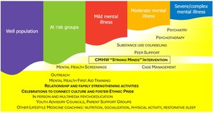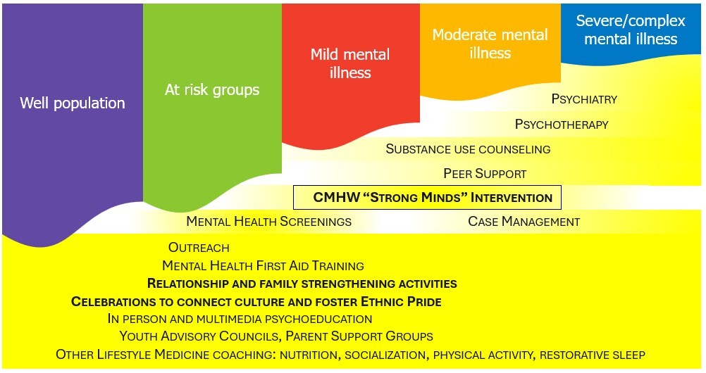 El Futuro provides a practical example of how culturally responsive, community-embedded mental health care can address persistent access gaps for immigrant populations in North Carolina through a stepped-care model (Figure 1). This approach designs culturally grounded services across the full spectrum of need, from prevention and early intervention to outpatient treatment for mild, moderate, and severe mental illness.