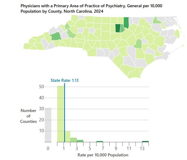 Challenges lie in pregnant and postpartum women accessing care in North Carolina, including mental health services. In the state, 20% of counties are maternity care deserts and 17% of counties have low or moderate access to maternity care.6 Additionally, there is a significant lack of perinatal mental health services in North Carolina, particularly in rural areas, with 31 counties having no practicing psychiatrists (Figure 2).