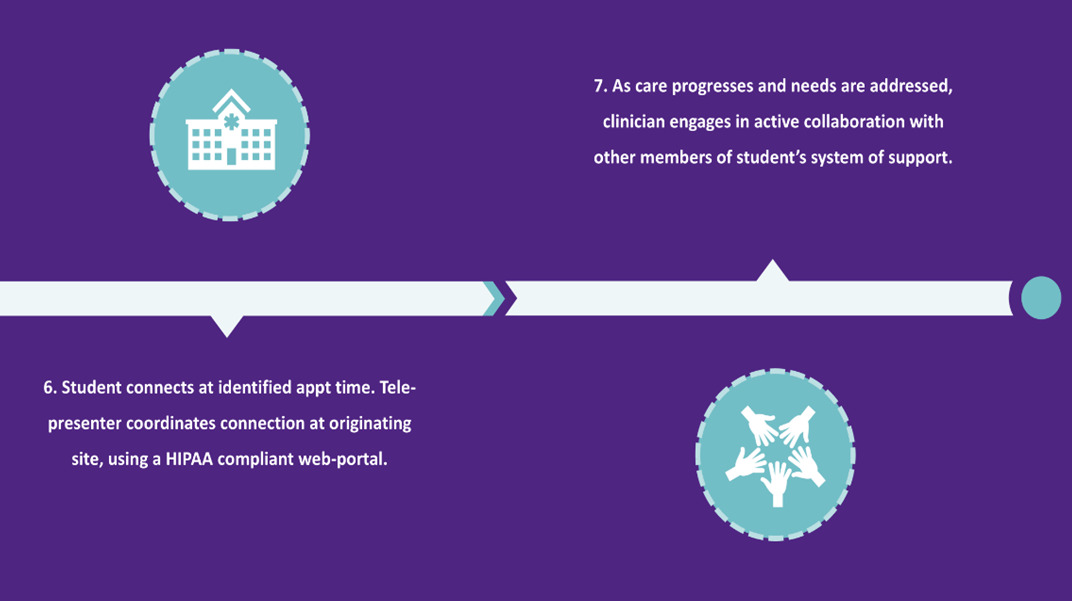External community-based supports (outpatient mental health therapists, caseworkers/child protective service agencies, primary care providers/pediatricians, health department providers) and pre-existing in-school supports (co-located school-based mental health providers, other virtual school-based telehealth providers, community organizations running in-school support programming) are also incorporated into shared care planning and coordination efforts with proper consent. These approaches have contributed to: