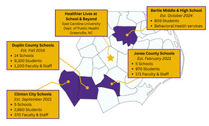 In 2016, during its initial planning phase, the HLSB program was designed to replicate the model of a traditional school-based health center while innovating by delivering services remotely within schools, an approach that was largely uncharted at the time. This delivery model allowed for a team of multidisciplinary health care professionals practicing within a regional academic medical center—the Brody School of Medicine (BSOM) at East Carolina University (ECU)—to provide real-time nutrition counseling, behavioral health, and acute medical services to students, faculty, and staff in rural school districts. Initially piloting in three initial schools, as shown in Figure 1, the HLSB program has since expanded to include 26 public schools (pre-K–12) across four rural Public School Units (PSUs) in Eastern North Carolina. Communities within this catchment are designated as Mental Health Professional Shortage Areas and are collectively home to over 13,300 enrolled students and 1745 employed school faculty and staff.1,7