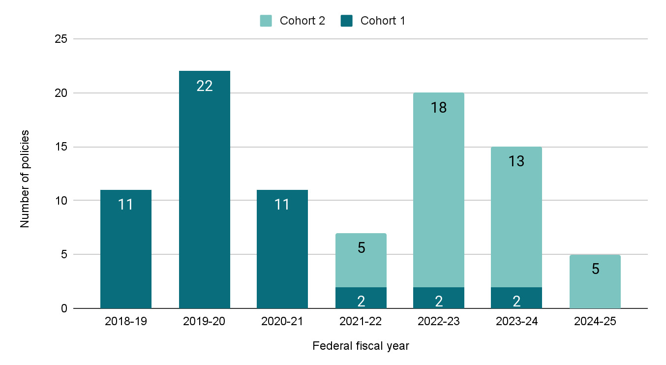 Across both cohorts, the majority of policies addressed mental health referral systems, including the use of evidence-based practices in the clinical setting, admission criteria, mechanisms for clinician oversight, policies for limiting student time out of class, and parental consent for services. LEAs in Cohort 1 placed additional focus on the creation and improvement of risk assessment and suicide ideation protocols, with 12 such policies created or amended over the course of the grant. Following the creation of NC AWARE’s Suicide Risk Protocol, 69 of 115 public school units in North Carolina used this protocol as part of their School Mental Health Plan submission in 2021. In Cohort 2, policies also address approaches to Medicaid reimbursement, including enrollment, parental consent, and mental health team procedures when seeking reimbursement. Figure 1 shows the number of policies implemented in each of the cohorts by year.