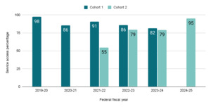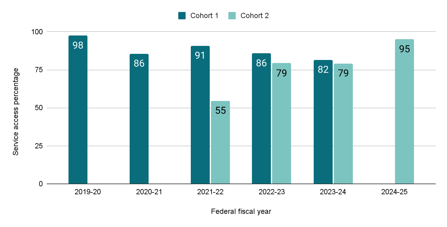 System coordination and staffing resulted in an average of almost 4000 students served each year through NC AWARE since 2019. Cohort 1 showed an average access rate (percent of students who receive services out of total referred) of 89%; the current average in Cohort 2 is 77%. In addition, Cohort 2 shows annual increases in access rates since implementation began (Figure 2).