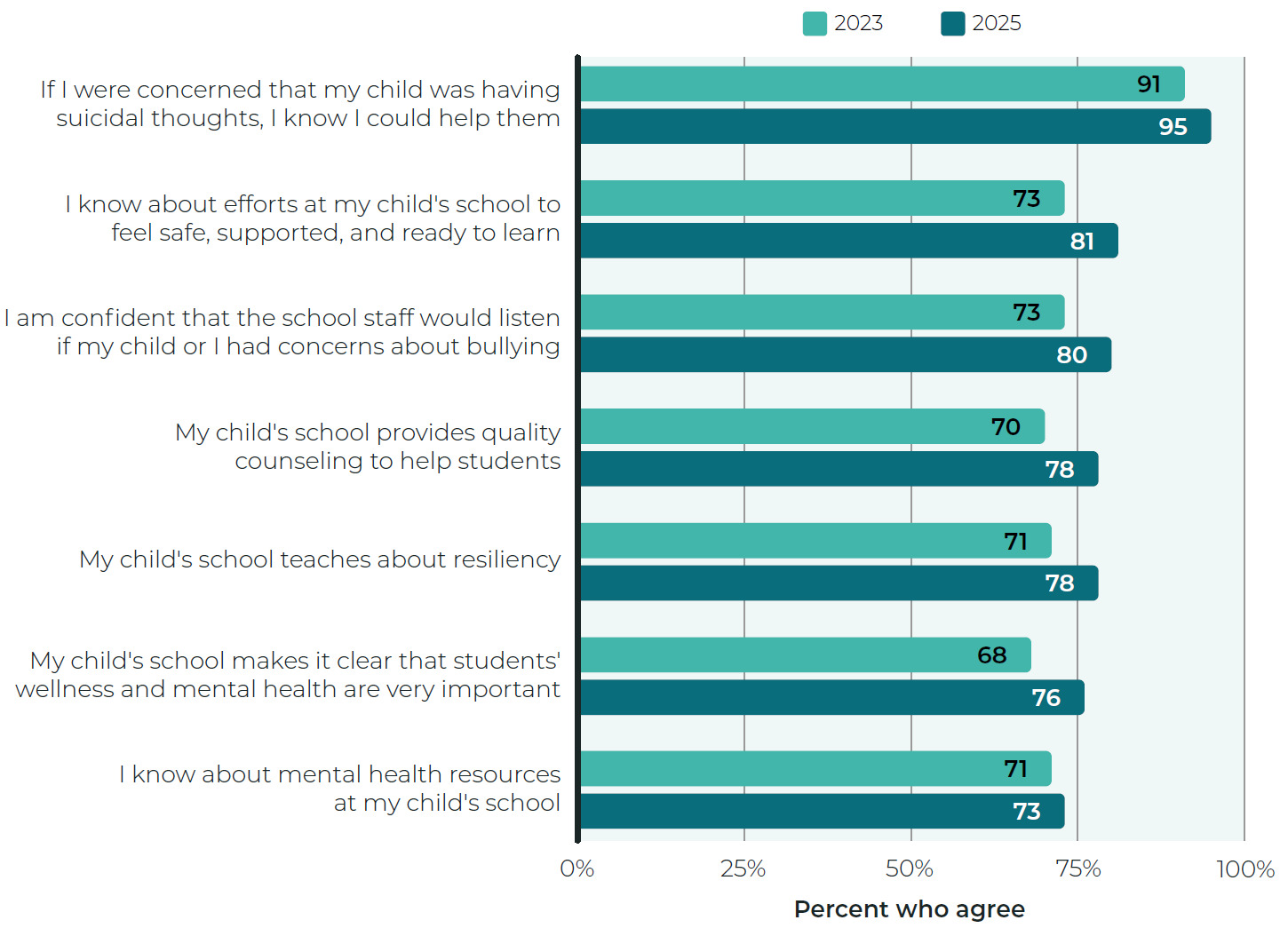 One area of significant growth for Cohort 2 is in LEA engagement with families. Families in each district were surveyed at two points in time (year two and year four of the grant). Compared to 2023, families in 2025 showed increased awareness of district mental health services across all three districts. In particular, family perceptions of school focus on students’ mental health, efforts to make students feel safe and supported, and the provision of quality counseling increased eight percentage points over two years. Figure 3 provides an overview of family responses across all three sites in 2023 and 2025. In addition to these measures, families also reported increased collaboration on children’ s mental health services and increased willingness to seek help for a child’s mental health if the child showed changes in thinking, feeling, or behaving.