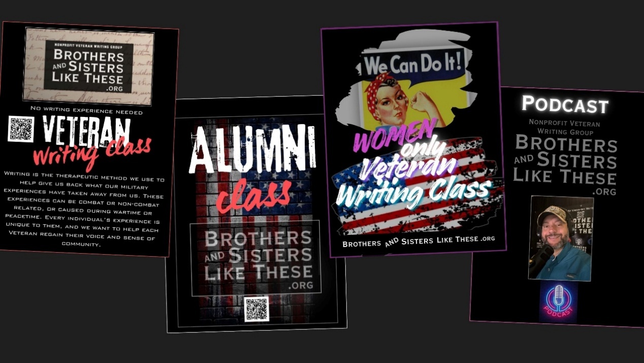 What makes the Brothers & Sisters Like These program unique is best illustrated by three main points. First, the program offers several writing courses: an initial writing course, an alumni writing course, a women-only Veteran writing class, and hybrid/remote classes. Each course lasts eight sessions (once a week for about one to two hours), with a counselor and B&SLT board member who co-facilitate each session. Each class is formatted in a similar manner to create emotional consistency throughout our sessions (Appendix A shows examples of B&SLT program flyers).