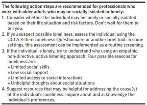 Research demonstrates inconsistent evidence of effectiveness of most interventions aimed at addressing social isolation and loneliness. In July 2020, the Suicide Prevention Resource Center (SPRC) published “Reducing Loneliness and Social Isolation among Older Adults,” which identified three key steps for reducing loneliness and social isolation.16 The report notes that it is important to recognize that loneliness has different causes and match the approach to the unique needs and preferences of the individual. Table 1 provides a summary of SPRC’s proposed action steps, reflecting this individualized approach.